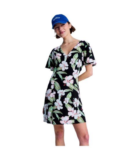 Fuentes: Información oficial del producto Roxy y especificaciones del artĆculo ERJWD03943 (material: 100% viscosa, escote en pico, mangas mariposa, largo mini).